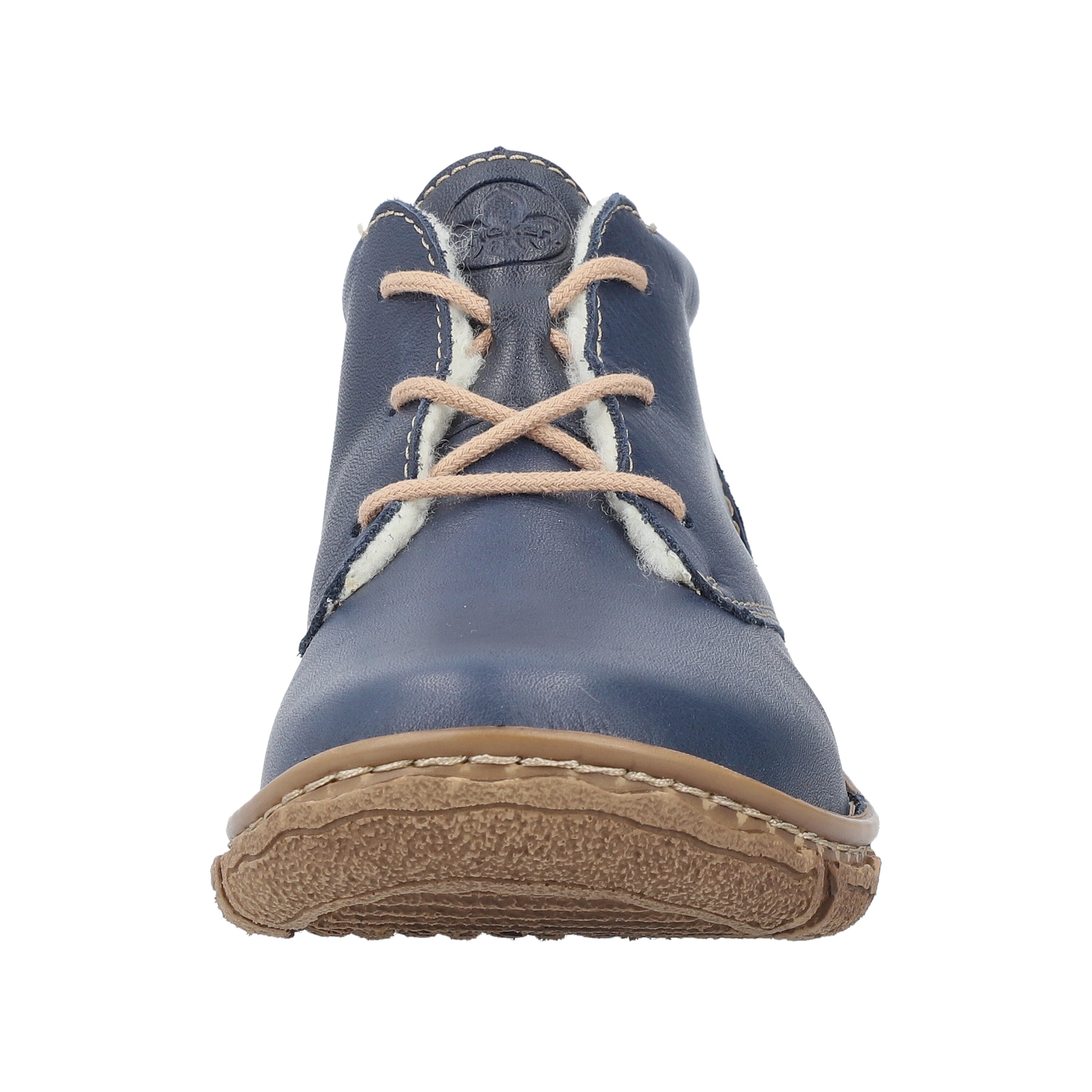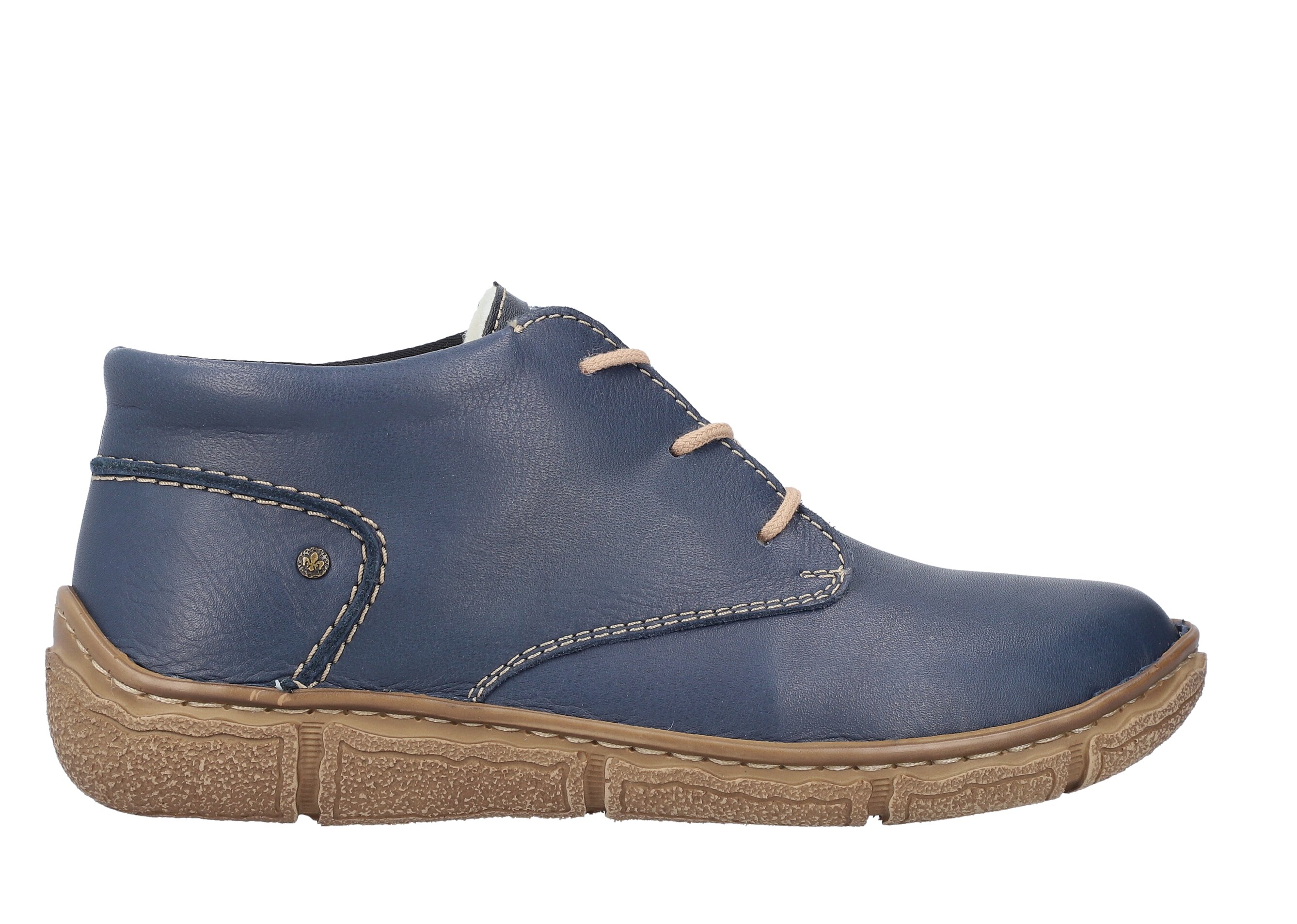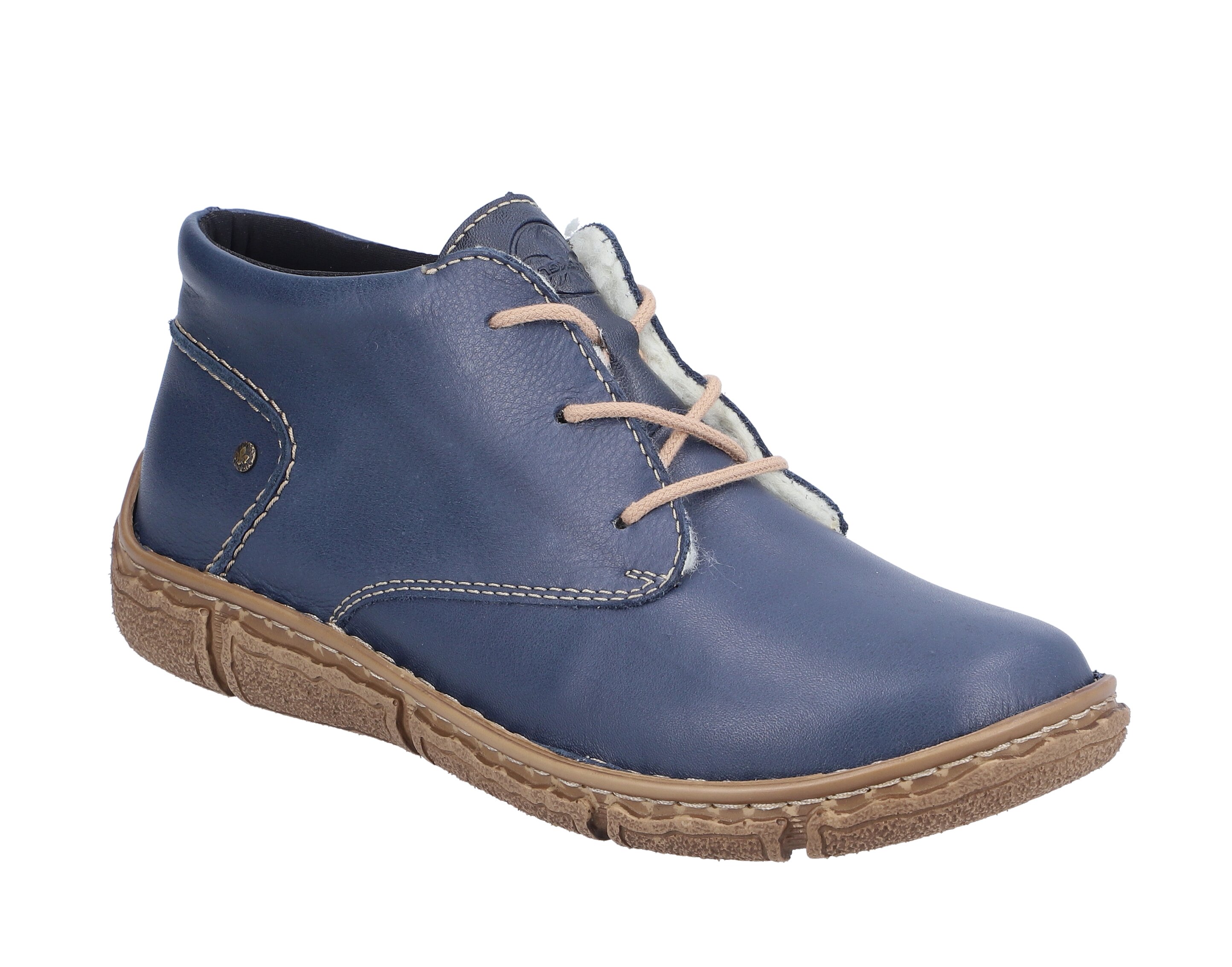 Šněrovácí kotníkové obuv. Obuv je vyrobena z hladké kůže, vnitřní materiál je textil, stélka je syntetická. Obuv je zateplena. Obuv je v šíři G. Výška podpatku je 3 cm. Podešev je flexibilní, syntetická. Barva tohoto modelu je modrá.